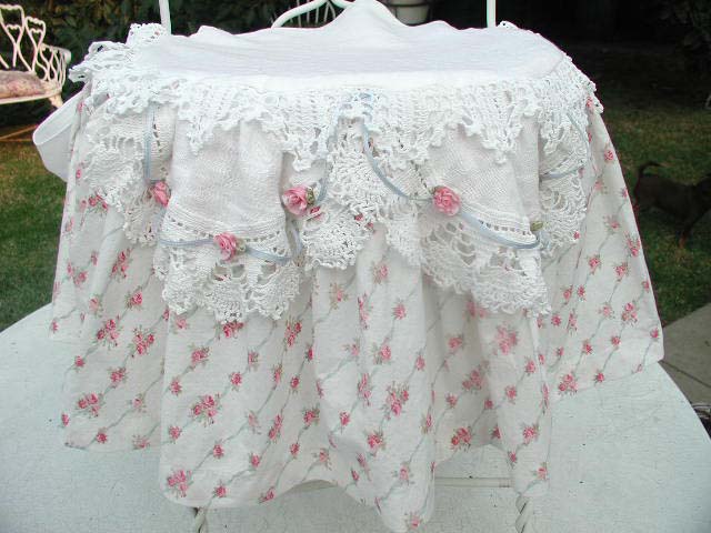 Designed by Liz Mac Intyre, well known in Los Angeles for her Baby Clothes with a vintage flair. She is now doing a line of slip covers that she calls "dresses for your chairs". The skirt is made from Simply Shabby Chic Rose Parlor cotton fabric while the seat and ties have been made with a high quality linen and it has been trimmed with vintage linen doilies and crocheted lace. It has been designed to fit on an Ice Cream Chair, but it can be used on any chair that is 13" in diameter with back posts that are set 12" apart. If you want to purchase an ice cream chair I can direct you to someone on ebay who has them for sale. The skirt drop is 10", so that the twisty chair legs show. Notice how she created some texture in this design with the ribbon and the silk roses depicting the design in the Shabby Chic (tm) Rose Parlor