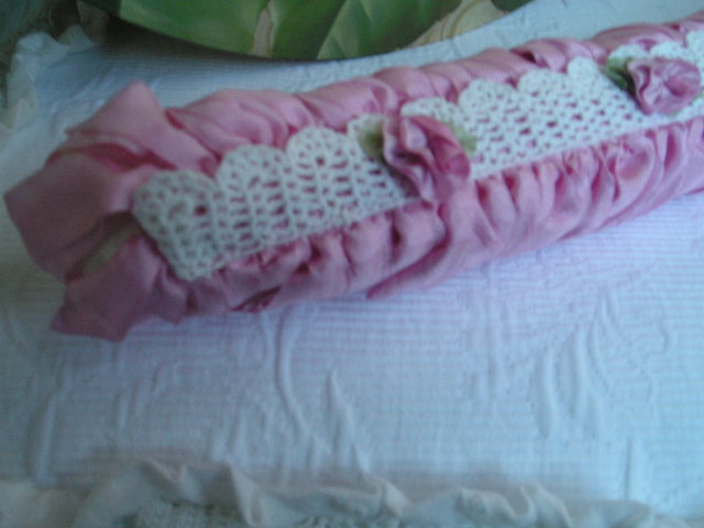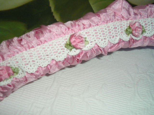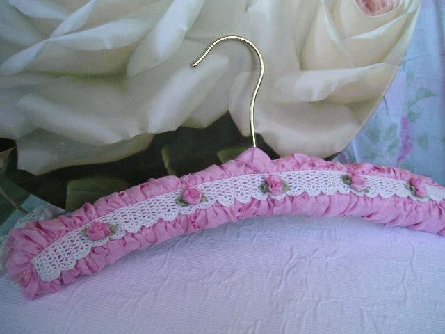 Decadent Pink Ribbon fringe surrounds this softly padded hanger. It is embellished with gorgeous Vintage Lace and two-tone Pink silk roses for an effect that is fabulous. The perfect shade of pink (matches most shabby pinks and Urban Garden's line of fabrics)makes this a must for your shabby decor. Hang your favorite Vintage dress or nightie or just place on your boudoir mirror to enjoy every day. Hanger measures 15". ~ Please click on pictures for a closer look ~