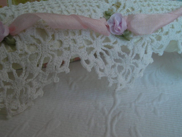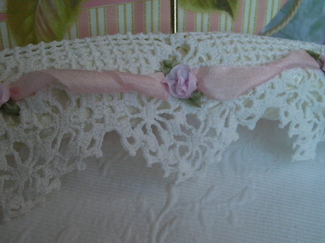 This is one of my favorite Vintage hangers. The cream Vintage lace is so delicate and looks fabulous embellished with pale pink ribbon gently twisted with Pale Pink silk roses. The back is trimmed in a delicate white vintage look crochet trim. Padded ivory satin hanger measures a full 15". ~ Please click on pictures for a closer look ~
