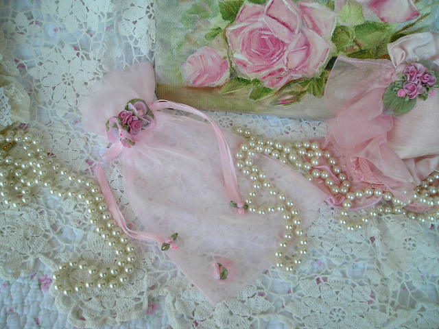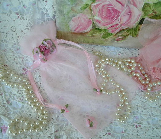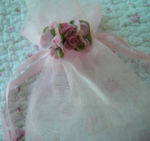 These delightful organdy gift bags are perfect for jewelry, gift cards and small items. The pink satin drawstring is accented with dainty pink rosebuds. The center is adorned with silk pink roses, rosebuds and velvet leaves. Measures about 5 1/2" by 9". Made by My Baby's Closet.