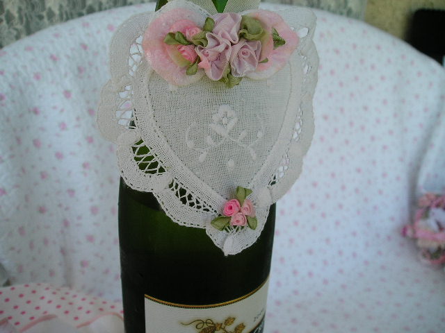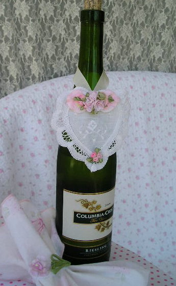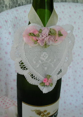 Our lovely battenburg lace Hearts are accented with the perfect silk pink roses and leaves along with ribbons to lend a decorative touch to your table, shower or tea party. Makes a perfect gift for the hostess or for table decor at a shower or tea party. Designed by Liz MacIntyre and made in USA. Measures about 4" by 4" and fits any wine or Sparkling cider bottle.