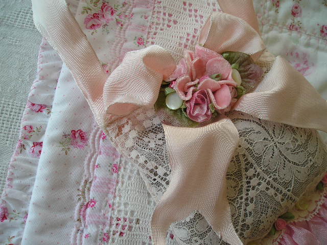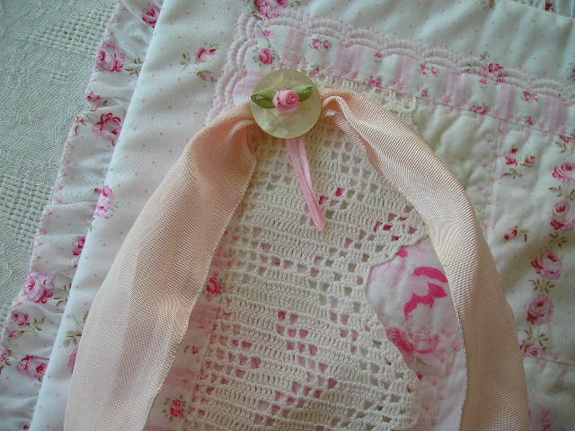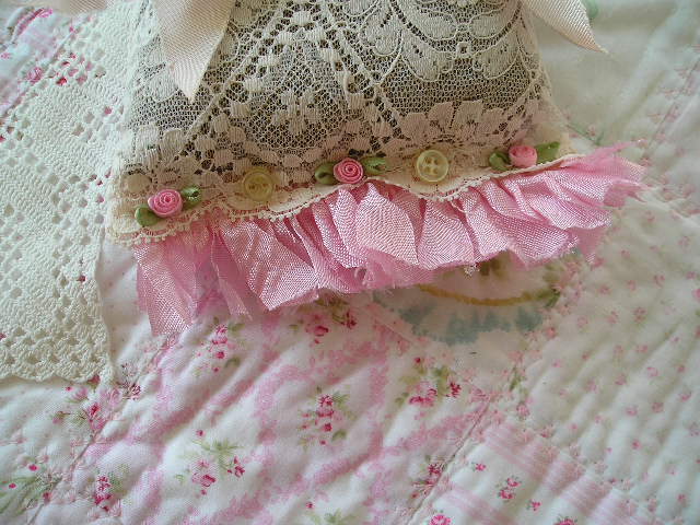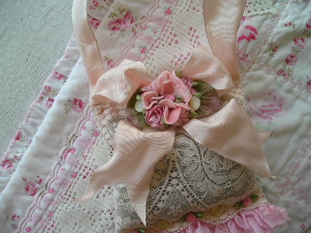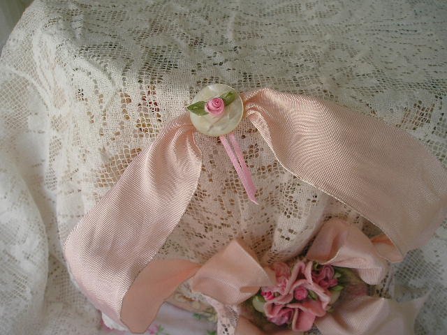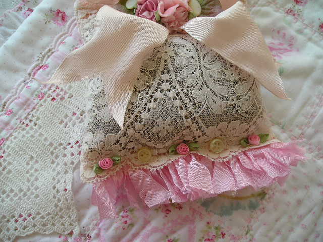 This elegant sachet with silk roses is just gorgeous. Made from vintage pink lace and lots of silk and velvet roses along with vintage buttons and velvet leaves. Ribbon fringe and a ribbon hanger, complete with a vintage button accented with a tiny rosebud add details. The sachet is filled with fresh fragrant lavender. Measures about 5" by 5" plus the ribbon hanger.